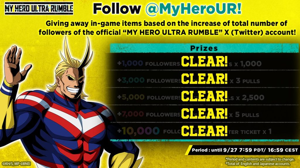 Giving away Free in-game items based on if the total number of followers on the Official My Hero Ultra Rumble X (Twitter) account reaching the goals set out in the image below!