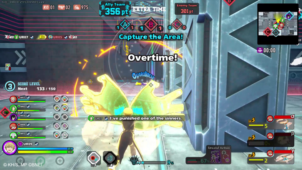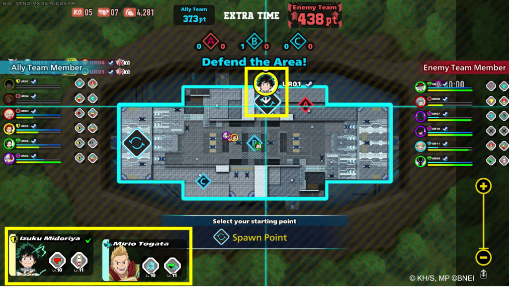 In this mode, two teams compete to control three areas on the map. Within a 5-minute time limit, each team must earn as many points as possible by capturing zones. If players are knocked out, they can respawn and switch between two different characters.